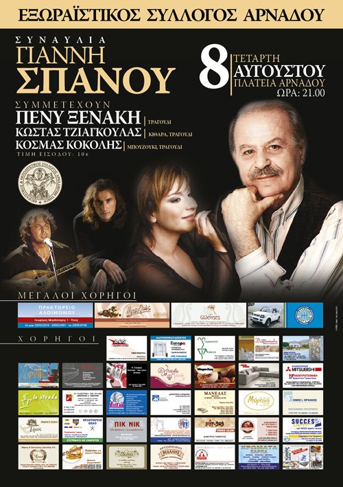 Τετάρτη 8 Αυγούστου Πλατεία Αρνάδου Ώρα 21.00