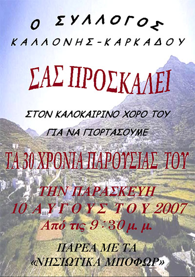 Ο σύλλογος Καλλονής - Καρκάδου σας προσκαλεί, στον καλοκαιρινό χορό του για να γιορτάσουμε τα 30 χρόνια παρουσίας του, την Παρασκευή 10 Αυγούστου 2007 από τις 9:30 μ.μ. "Παρέα με τα Νησιώτικα Μποφόρ"