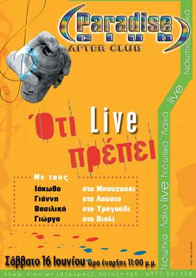 Το Σάββατο 16 Ιουνίου, το Paradise Club διοργανώνει live, με νησιώτικη και λαϊκή μουσική. Θα παίξουν, ο Ιάκωβος (μπουζούκι), ο Γιάννης (λαούτο), η Βασιλική (τραγούδι) και ο Γιώργος (βιολί). Ώρα έναρξης 11.00 μ.μ.