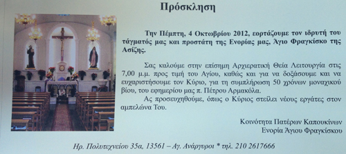 Την Πέμπτη , 4 Οκτωμβρίου 2012 γιορτάζουμε τον ιδρυτή του τάγματος και προστάτη της Ενορίας μας , Άγιο Φραγκίσκο της Ασίζης.