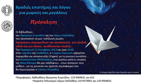 Mε μια εκδήλωση γεμάτη αφηγήσεις και κατασκευές για παιδιά, αλλά και για όσους αισθάνονται παιδιά… εγκαινιάζεται την Παρασκευή 12 Οκτωβρίου 2012 και ώρα 18:00, η συνεργασία της Βιβλιοθήκης του Ιδρύματος Ευγενίδου και της Βιβλιοθήκης του Δήμου Καλλιθέας.