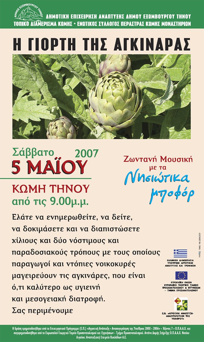 Η Δημοτική Επιχείρηση Ανάπτυξης, Δήμου Εξωμβούργου Τήνου, το Τοπικό διαμέρισμα Κώμης Τήνου και ο Ενωτικός Σύλλογος Περάστρας Κώμης Μοναστηρίων σας προσκαλούν στην γιορτή της αγκινάρας το Σάββατο 5 Μαϊου 2007 στην Κώμη της Τήνου από τις 09:00π.μ. για να δοκιμάσετε χίλιους δυο τρόπους με τους οποίους μπορούν να μαγειρευτούν οι αγκινάρες που είναι ότι καλύτερο ως μεσογειακή και υγιεινή διατροφή.