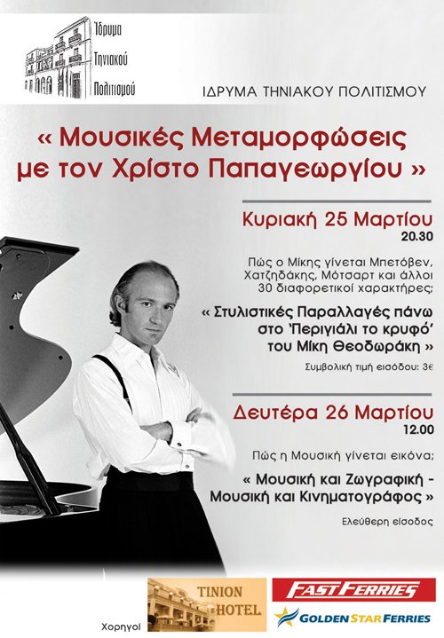 Μουσικές Μεταμορφώσεις με τον Χρήστο Παπαγεωργίου - Κυριακη 25 Μαρτίου 20.30- Δευτέρα 12.00 στο Ιδρυμα τηνιακού πολιτισμού
