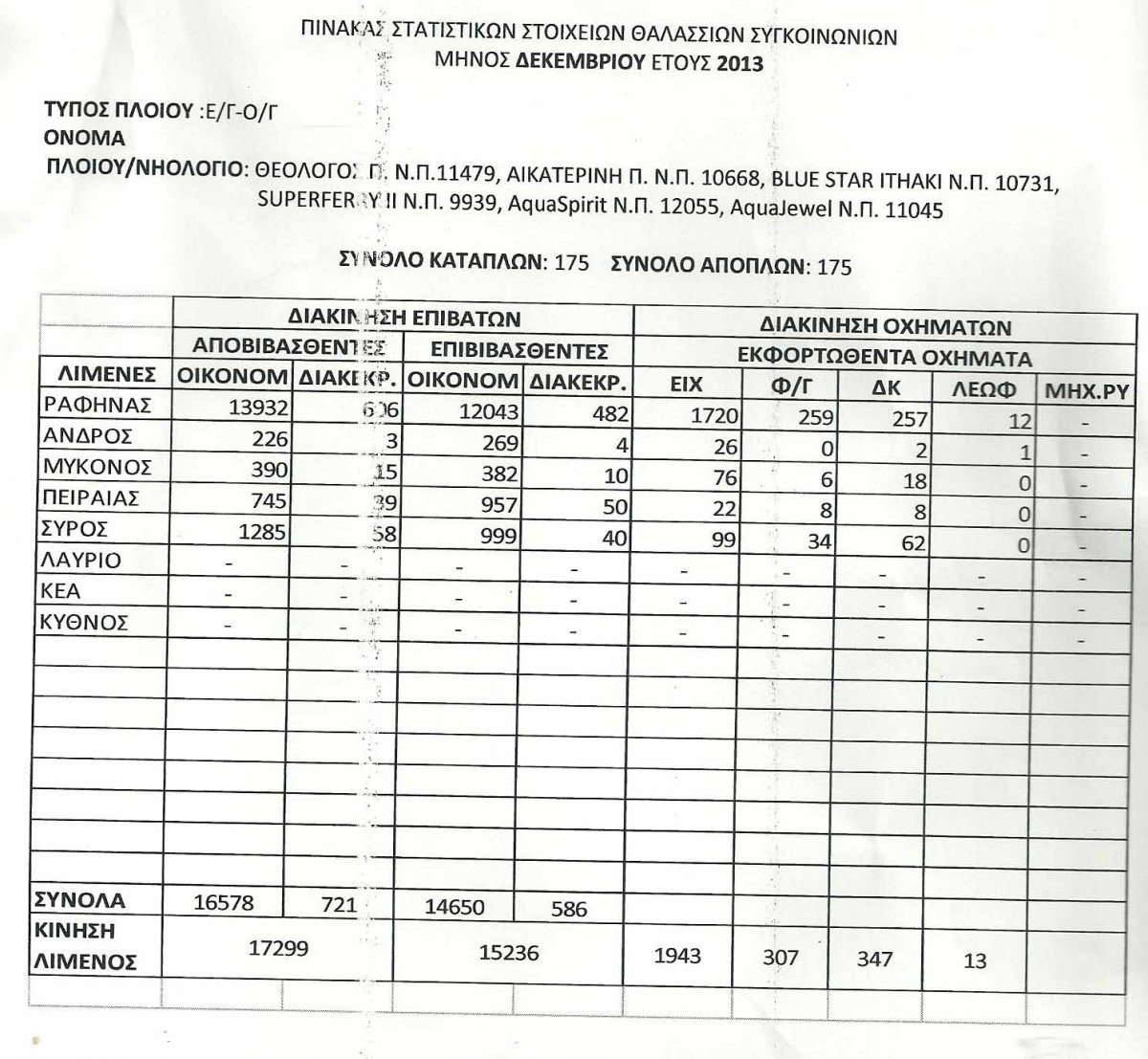 ΣΤΑΤΙΣΤΙΚΟΣ ΠΙΝΑΚΑΣ ΔΙΑΚΙΝΗΣΗΣ ΕΠΙΒΑΤΩΝ ΛΙΜΕΝΟΣ ΤΗΝΟΥ ΔΕΚΕΜΒΡΙΟΥ 2013