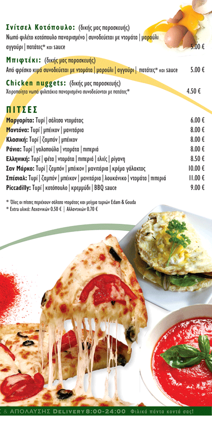 *extra υλικά :λαχανικών 0.50ευρώ,αλλαντικών 0,70ευρώ