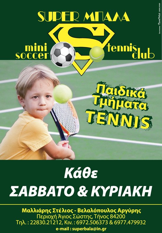 Παιδικά τμήματα Tennis Κάθε Σάββατο & Κυριακή Μαλλιάρης Στέλιος - Βελαλόπουλος Αργύρης Περιοχή Άγιος Σώστης , Τήνος 84200 Τηλ. 22830-21212 , Κιν. 6972506373 & 6977479932 email : superbala@in.gr
