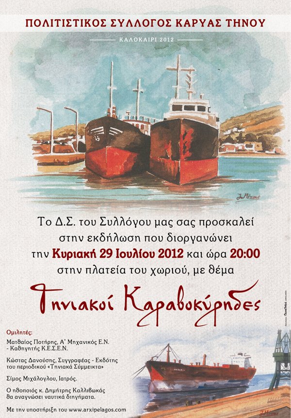 Το Δ.Σ. του Συλλόγου μας σας προσκαλεί στην εκδήλωση που διοργανώνει την Κυριακή 29 Ιουλίου 2012 και ώρα 20.00στην πλατεία του χωριού , με θέμα Τηνιακοί Καραβοκύρηδες