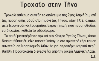 Το ατύχημα συνέβη μπροστά στο πρακτορείο του κου Πετρόπουλου. 3 ημέρες μετά, το σημείο αυτό περιφράχτηκε για να πεζοδρομηθεί. Ευχόμαστε το πεζοδρόμιο να είναι για πεζούς και ποδήλατα και όχι για τραπεζάκια, ταμπέλες και καρέκλες.