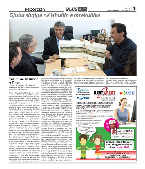 Nga ana e tij, kryetari i Bashkisë së Tinos, Panajotis Kunderas falenderoi z. Ambasador për vizitën si dhe shtoi se: “Jam dakort me juve, z. Ambasador, për sa thatë për ishullin tonë, është ndërtuar nga duart e njerëzve, me punë të ashpër e të vazhdueshme, por është edhe ishulli i artit dhe i kulturës, plus dhe karakteristikës sonë të veçantë, Kishës me famë të Shën Mërisë, “Evangjelistria”. Në Tino, pavarësisht krizës ekonomike, kemi akoma një komunitet të madh shqiptarësh. Duhet të pranojmë se janë njerëzit që kanë mbështetur realisht ekonominë e ishullit, sidomos në periudhat e vështira e me shumë punë, për ndërtimin e ishullit. Kemi shtetas shqiptarë që jetojnë këtu prej vitesh, janë integruar mjaft mire e kemi siguruar një bashkëjetesë harmonike për të dyja palët edhe pse është komuniteti më i madh i të huajve në ishull. Përsa i përket shkollës, Veronika erdhi shumë dinamike dhe entuziaste në zyrën time, nuk më la asnjë shkak dhe mundësi të mos e realizojmë kërkesën e saj. Veronika jetonte me këtë dëshirë, por dhe ne u kujdesëm që të gjitha veprimet e aktet në lidhje me këtë inisiativë të realizohen me miratimin e plotë të pushtetit lokal dhe të ministrisë së Arsimit, faktor mjaft pozitiv për të gjithë, e që në vijim është përqafuar ngrohtë nga komuniteti shqiptar këtu. Prezenca juaj në ishullin tonë është me shumë vlerë për pushtetin lokal, komunitetin vendas e komunitetin shqiptar, për ishullin në tërësi. Jemi të hapur për çdo bashkëpunim, jemi të devotshëm pasi besoj se lidhjet mes dy popujve tanë janë ekzistuese dhe të pashmangshme. Ky është dhe një fakt, një ngjarje që na detyron të jemi akoma më pozitivë ndaj një bashkëpunimi të mëtejshëm. E njohim emigrimin, edhe grekët kanë emigruar prej vitesh në vendet perëndimore. Ja dhe një arsye më tepër që ne, si Bashkia e Tinos të përpiqemi të jemi afër komunitetit shqiptar, të ndjehen mirë e lirshëm e t’i mbështesim në nevojat e kërkesat e tyre...” thekson z. Panajotis Krondiras.